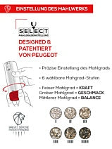 Захваљујући компактном дизајну и ребрастом кућишту, електрични млин Line савршено лежи у руци и интуитиван је за употребу у кухињи. Посуда у облику левка олакшава отварање и пуњење. Прецизно подешавање u'Select употпуњује пакет. Прстен за подешавање на дну млина је градуиран од један до шест и обезбеђује конзистентан ниво млевења, без обзира на изабрану величину, прилагођавајући се тако свим жељама. Електрични млин Line се већ показао као савршен поклон за сваку прилику.